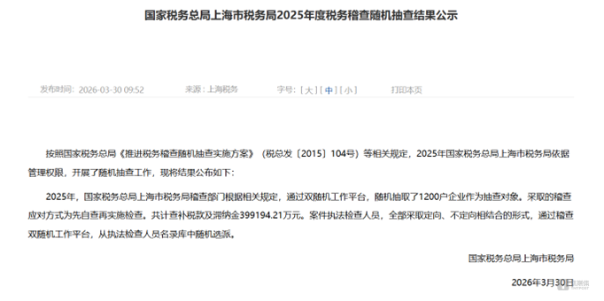 2026年3月底,上海市税务局公布2025“双随机、一公开”抽查结果:通过平台随机抽取 1200 户企业开展税务稽查,全年共查补税款及滞纳金合计 39.92 亿元,与2024年同口径金额相比,涨幅接近78%。